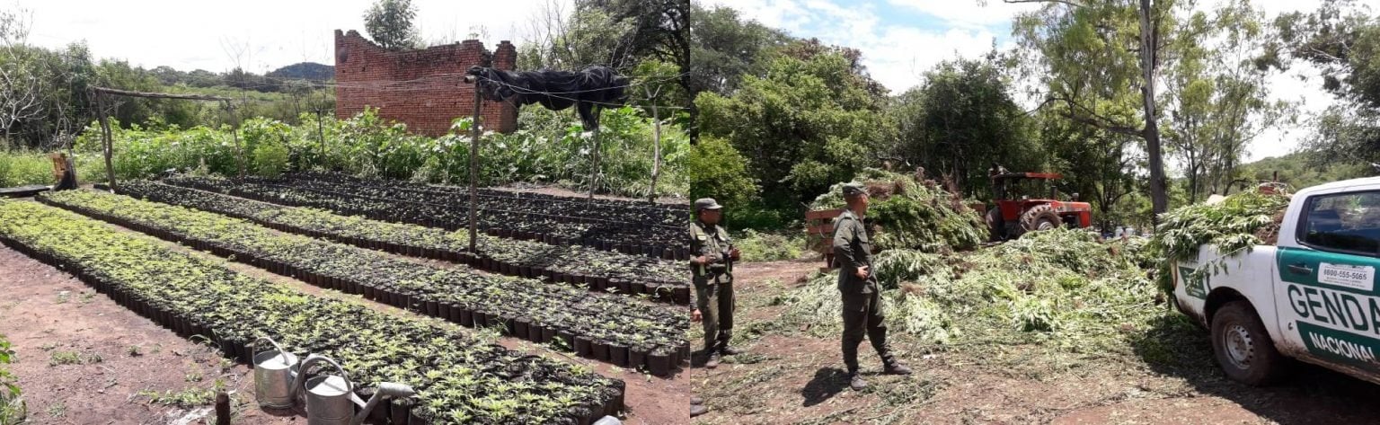 El propietario tiene domicilio en Monterrico y la finca está ubicada a 7 km de La Caldera, Salta, por lo que se trasladaba fácilmente de un lugar a otro -Hay dos detenidos -Personal de investigación antidrogas realizó operativo policial de suma importancia para la sociedad jujeña ,por cuanto secuestraron más de diez mil plantas de marihuana – armas – motocicletas – celulares y mucho material para plantar, cultivar y distribuir estupefacientes -En el operativo detuvieron a 4 personas : propietario de la finca – un masculino con domicilio en Monterrico y 2 que estaban a cargo de la misma – El operativo se realizó luego de 6 meses de ardua tarea investigativa asevero el jefe del Escuadrón 53° de Gendarmería de Jujuy, Ramón Domínguez -El comandante señaló que el domicilio del propietario en Monterrico, Jujuy, estaba ubicado a 7 km de la finca en La Caldera, Salta, por lo que el sujeto se trasladaba con facilidad de un lugar a otro por la Ruta 22, cruzando el río Las Pavas.Se secuestraron tambien 2.400 plantas de cannabis sativa ; 170 cm de altura, 7.205 plantines de marihuana, 1.008 plantines de germinación de marihuana, 71.395 gramos aproximadamente de cogollos de marihuana, $15.000, rifle calibre , 2 motocicletas, revólver calibre 22 , 305 gramos de semillas de marihuana, 5 litros de insecticida, 5 litros de micorriza (fertilizante para semillas), 5 litros de trichoderma (fertilizante para semillas), 24 mochilas para fumigación, dos bolsas de cal por 25 kg cada una, dos balanzas, dos generadores, una prensa casera, 18 contenedores con distintos químicos, 29 bandejas de setenta y dos celdas para almácigos, dos garrafas de 15 kilos con sus respectivas pantallas de calefacción, tres picadoras de vegetal, 3 celulares y una camioneta -En otros 2 domicilios de Monterrico secuestraron 1 automóvil Ford K – una caja con 27 municiones del 22 – envoltorio con semillas de 84 grs – una caja conteniendo sustancia vegetal con un peso aproximado de 1.448 gramos – 2 paquetes rectangulares con sustancias vegetal, con un peso de 1.924 grs – 2 celulares – balanza digital – $ 840.000, una caja con 25 municiones 9 mm y documentación de interés para la causa – El efectivo indicó además que “la causa recién comienza”, por lo que la imponente cantidad de droga incautada continuará en análisis “para determinar qué especies de plantas son, el poder tóxico que contienen» –